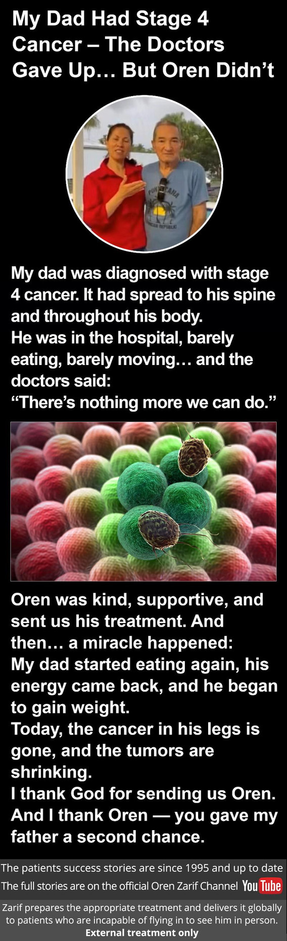 I was diagnosed with cancer, it spread to my liver and became a stage 4 cancer. Many thanks to Oren